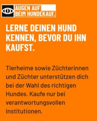 Viele weitere wichtige Informationen finden Sie auf der Webseite Augen auf beim Hundekauf / www.hundekauf.ch des Bundes (BLV) und unseres Dachverbandes (Schweizer Tierschutz STS)