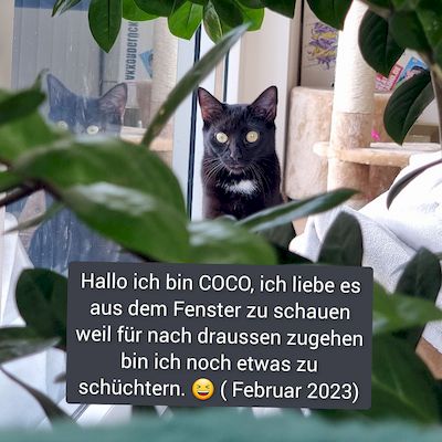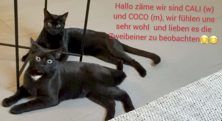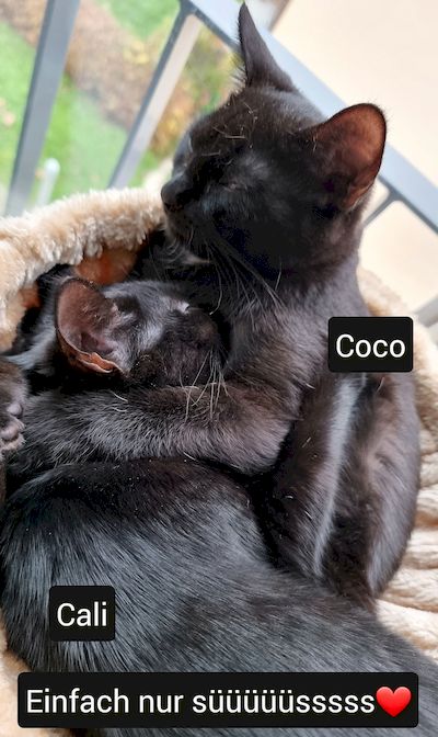 Wir sind Cali (w) und Coco (m). Wir leben seit Oktober 2022 in unserem ForeverHome und haben uns seit dem 1. Tag schon sehr wohl gefühlt, zusammen mit unseren neuen Freundin und unseren neuen Katzenmama. Nun stellen wir uns kurz vor: