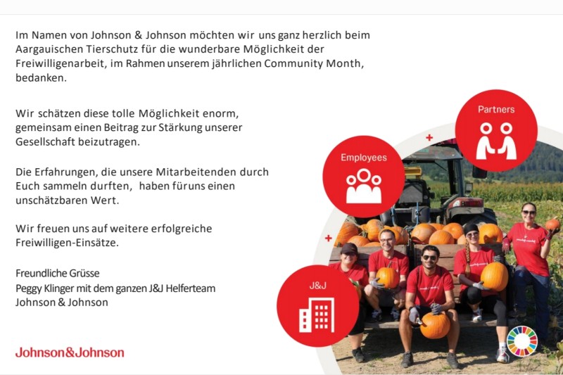 Im September brachten Mitarbeitende von Johnson & Johnson mit Freude und Engagement den Aussenbereich und einige Tiergehege auf Vordermann. Für unsere Tiere standen Streicheln & Spielen auf dem Verwöhnprogramm. Nun haben wir sogar ein herziges Dankeschön-Schreiben bekommen, dafür dass sie uns bei unserer Tierschutzarbeit helfen konnten. Es liegt aber an uns DANKE zu sagen für eure langjährige immer wieder hilfreiche Unterstützung.