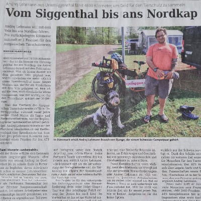In seinem Spendenprojekt im Rahmen der Raiffeisen "Lokalhelden" fährt Andrej Lehmann von seinem Zuhause im Aargau mit dem Velo nach Norwegen. Geht sein Plan auf, wird er während rund 48 Tagen versuchen das Nordkap zu erreichen und dabei zirka 4600 Kilometer zurücklegen. Seine Reise dokumentiert er auf seinem Instagram Kanal cycling_paw. Für jeden Fahrkilometer wünscht er sich mindestens einen Spendenfranken für den Aargauischen Tierschutzverein. Derzeit (Stand 18.05.2023) ist er in Schweden unterwegs und bisher sind bereits 1290.- Franken an Spendengeldern zusammengekommen.