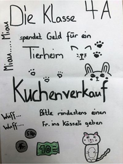 Die Klasse 4A der Primarschule Turgi hat am Schulhausfest im Juni Kuchen verkauft. Den Erlös in Höhe von 310.45 CHF haben die Kinder dem ATs Tierheim gespendet.
