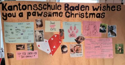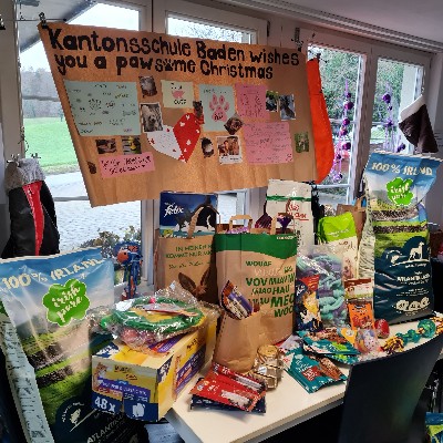 Drei Schüler der Kantonsschule Baden brachten als Vertreter ihrer Klassen G1i, G1J und G1L gemeinsam mit ihrer Lehrerin eine grosse Ladung Futter und Spielzeug bei uns im Tierheim vorbei. Die Schüler haben ein Teil ihres Taschengeldes für den Futterkauf eingesetzt und die Lehrerin hat auch etwas beigesteuert. Alle gemeinsam haben ein grosses Plakat kreiert, mit dem sie uns und unseren tierischen Schützlingen "Pawsome Christmas" wünschen.