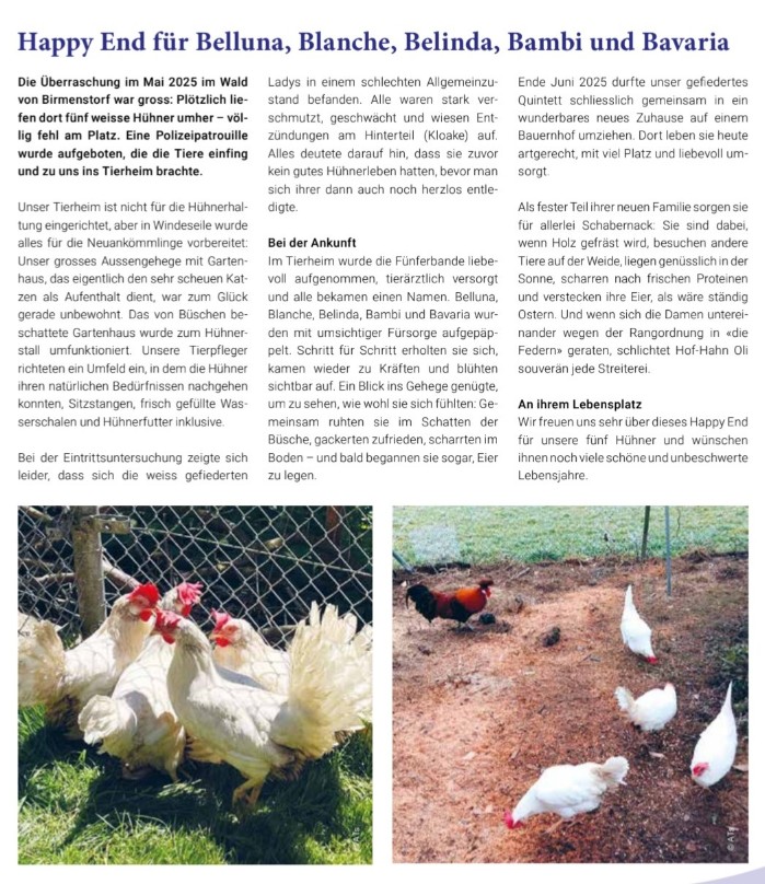 Wir berichten über das Happy End von fünf weissen Findel-Hühnern, die im Wald aufgefunden wurden. In unserer Rubrik "Davina schaut hin und denkt mit" streift Davina durch ein besonders wildes Revier: die Kommentarspalten der sozialen Medien. Ausserdem erzählen wir euch noch, warum manche Jagdgesetze für uns alle gelten und geben euch einen Überblick über unsere Tätigkeiten im vergangenen Jahr.