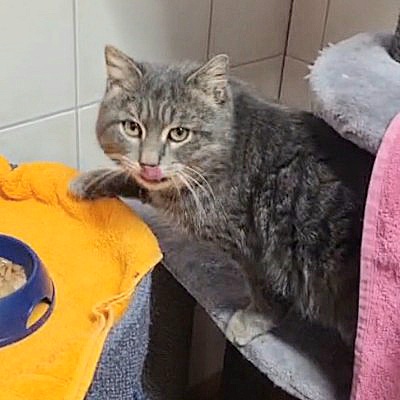 Kater Grey Boy war schon seit Sommer 2025 im Quartier Geelig unterwegs und zeigte sich dort zurückhaltend, aber freundlich. Da keine Besitzer ausfindig gemacht werden konnten, kam er zu uns. Die ersten paar Wochen fand es Grey Boy bei uns überhaupt nicht toll und zeigte sich beim Kennenlernen wenig kooperativ 😉 Vertrauten Personen gegenüber macht er jedoch langsam aber stetig Fortschritte, öffnet sich immer mehr und zeigt nun auch seine schmusige Seiten - wie man in den untenstehenden Videos beobachten kann. Deshalb braucht er wirklich geduldige Personen mit viel Zeit. Mit den anderen Katzen im Gehege kommt er gut zurecht. Für sein zukünftiges Zuhause tendieren wir aber zu einem Einzelplatz.