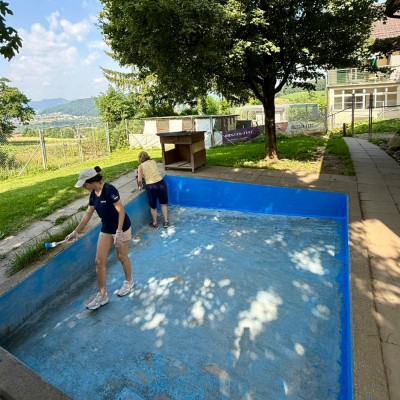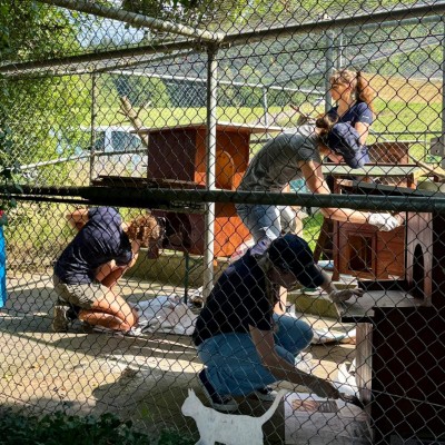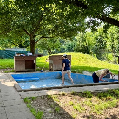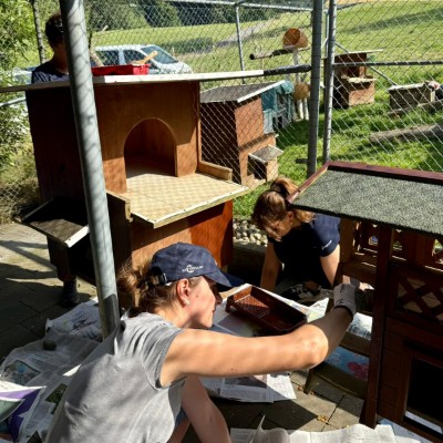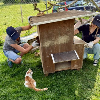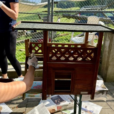 Sechs Mitarbeitende des Holcim-Konzerns haben mit Farbe, Pinsel, Freude und Engagement Schönheit und Frische in unser Tierheim gezaubert. Sie haben den Hundepool mit Spezialfarbe neu gestrichen, Katzenhäuschen mit einer Lasur ein längeres Leben eingehaucht, vom Sturm abgebrochene Äste im Hundeauslauf weggeräumt und überall Hand angelegt, wo es nötig war.