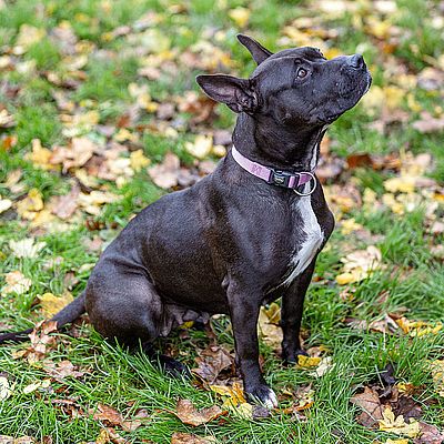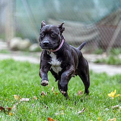 Rasse: Staffordshire Bull Terrier / dunkelbraun mit weissem Brustfleck