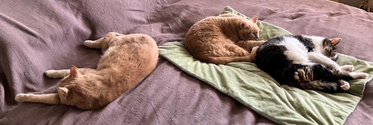 Allen Katzen geht es prächtig. Unser Senior Piero (rechts im Bild) hat seine nächtlichen Jaul-Attacken komplett verloren. Moritz und Max haben sich wiedergefunden und mögen sich wie eh und je und haben mit dem Senior eine tolle Beziehung geschaffen. Immer wieder gehen sie auf ihn zu und versuchen mit ihm Köpfchen zu geben. Auch putzen sich alle gegenseitig bis zu dem Punkt, wenn es dann dem Senior zu viel wird. Dann knabbert er bei ihnen am Ohr oder stösst sie mit einer Pfote leicht auf Distanz. Max hat Piero ausserordentlich gern. Sobald Piero sich nur etwas bewegt oder umhergeht, ist Max gleich bei Piero. Max und Piero haben auch ein sehr ähnliches Gemüt und verstehen sich echt blendend. Moritz wird eher mal auf die Seite gestossen, wenn er etwas energiegeladen um Piero herumschmeichelt. Sie können aber alle ruhig und kuschelig zusammen auf dem Bett schlafen. Piero und Max nebeneinander. Moritz mit etwas Abstand zu den beiden.