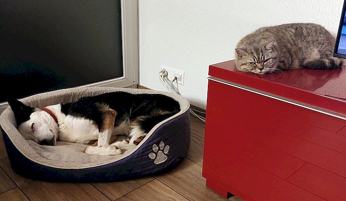 Minnosh war anfänglich sehr zurückhaltend, ist aber immer mehr aufgetaut und fühlt sich nun sichtlich wohl. Sie hat unsere Hündin Laky zwischenzeitlich als ungefährlich eingestuft und legt sich auch mal neben sie hin. Um die Katzen macht sie jedoch einen grossen Bogen und bekundet lautstark, wenn ihr eine zu nahe kommt. Unser BSH-Kater Happy ist aber hartnäckig und versucht immer und immer wieder Kontakt aufzunehmen. So darf er sich nun schon mal in Ihrer Nähe aufhalten. Für die grosse Liebe braucht es aber wohl noch etwas Zeit.