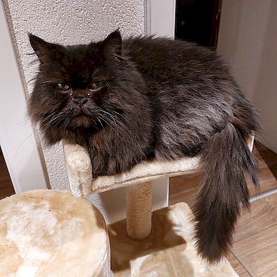 Nero hingegen war von Anfang an sehr neugierig und hat das Haus direkt erkundet. Er liebt es, auf unseren Katzenbäumen zu liegen und die Übersicht zu bewahren. Unsere Perserkatze Bella findet ihn sehr interessant, ist aber noch zurückhaltend und himmelt ihn gerne aus der Ferne an. Auf die Katzen reagiert Nero überhaupt nicht, eigentlich lässt er sie links liegen und geht stolz seiner Wege. Seine Einschränkungen merkt man kaum noch. Jedoch ist ihm Laky wohl nicht sehr geheuer und so wird diese von Nero regelmässig angeknurrt, wenn sie sich nähert. Laky macht das aber gut und geht ihm soweit es geht aus dem Weg.