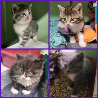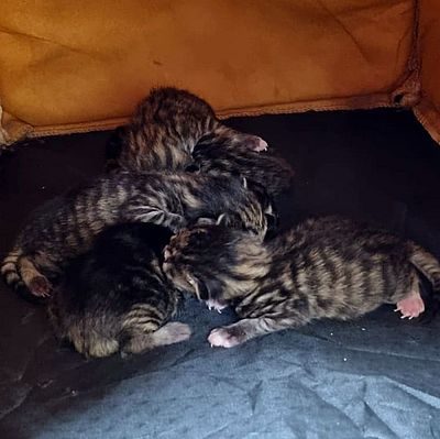 Zu den noch nicht vermittelbaren Katzenkindern gehören auch die Welpen von Katzenmama Fee. Fee kam aus einem Tierschutzfall zu uns - trächtig und in einem gesundheitlich schlechten Zustand. Wir konnten Fee noch etwas aufpäppeln, so dass Mutter und Welpen die Geburt überstehen konnten. Trotzdem war ihr Start ins Leben schwierig und besonders ein "Feenkind" muss immer noch ums Überleben kämpfen. Es wird derzeit stationär vom Tierarzt betreut und wir hoffen alle sehr, das dieser Kampf mit einem Happy End belohnt wird. Die anderen haben sich gut entwickelt und halten ihre Mama auf Trab.