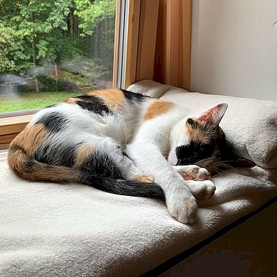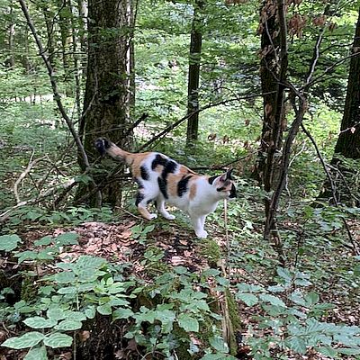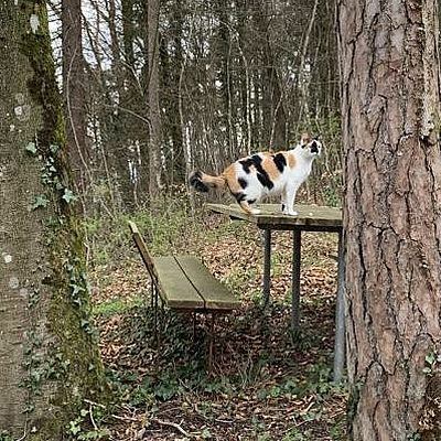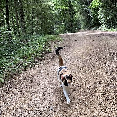Es gab eine Wartefrist mit „alleine" den Wald zu erkunden. Es gibt auch andere Mitbewohner im Wald, doch in der Zwischenzeit macht es Sally super. Einmal sah ich ein Reh weg springen und Sally hinterher, mit dickem Schwanz kam Sally zu mir und teilte mir mit was Sie erlebt hat. Sally darf den ganzen Tag draussen sein. Das Spannende ist, wenn es langsam dunkel wird kommt sie Heim und bleibt die ganze Nacht im Haus und schläft, wo es Ihr grad gefällt Okay, nachts ist das Katzentürli blockiert, das Risiko mit Fuchs und Marder gehe ich nicht ein. Wenn es hell wird darf Sally natürlich sofort raus.