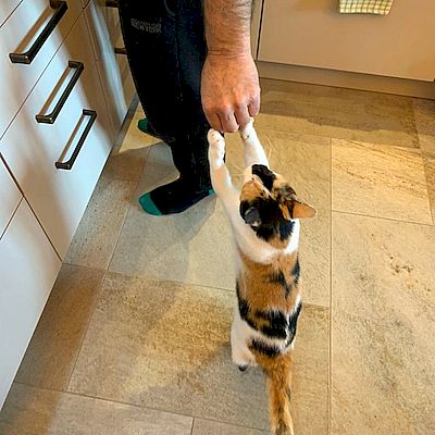 Den ursprünglichen Name von Selvaggia haben wir auf Sally gekürzt. Zum Rufen ist es leichter, wenn sie im Wald in den Bäumen, Sträuchern, Wiesen unterwegs ist. Vor gut 5 Monaten ist Sally bei uns eingezogen. Schon während der Autofahrt hat sich Sally sehr intensiv mitgeteilt, auch heute müssen wir schmunzeln wenn es zur Essenszeit zugeht. Auch zum z’ drü also z'vieri ist Sally dabei, rufen wir es gibt z'drü, egal wo Sally im Wald unterwegs ist, schwups steht Sie da Sally hat sich sofort wie zu Hause gefühlt, hat alles erkundet, alles war ihr, MEINS