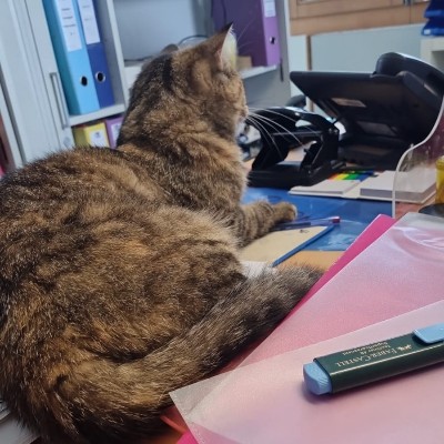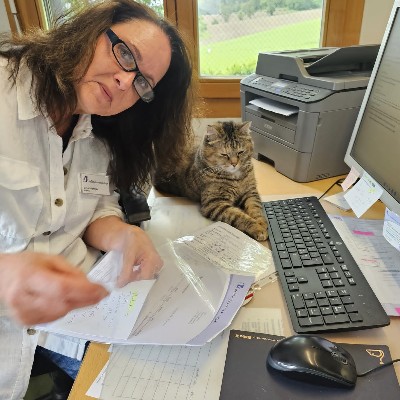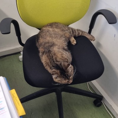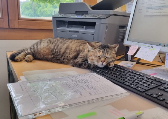 Shila hat sich den Job als Empfangsdame unter "die Kralle gerissen". Zuerst hat sie hauptsächlich den Eingangsbereich draussen vor dem Tierheim als neuen Arbeitsplatz in Beschlag genommen. Seit kurzem besucht sie uns und unsere Empfangsmitarbeiterin Ursula Grieder aber immer öfter auch drinnen und testet aus, auf welchem Untergrund es am bequemsten ist. Schreibtischstühle, Schreibtische, Dokumente und Tastaturen haben sich als beliebte Liegeplätze erwiesen.