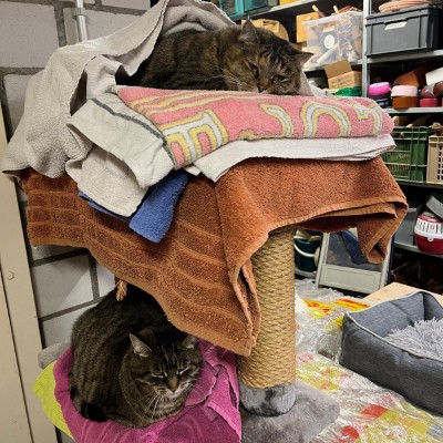 Und manchmal treffen sich die beiden Katzendamen Anika und Shila im Tenn zum gemeinsamen Träumen auf dem für unsere Tierheimkatzen dort eingerichteten Katzenbaum: