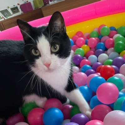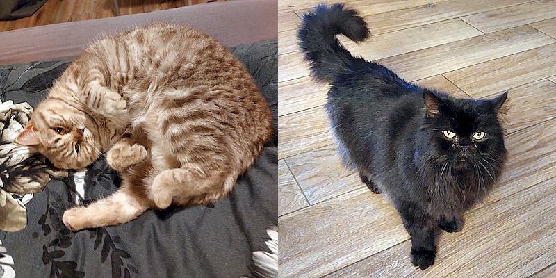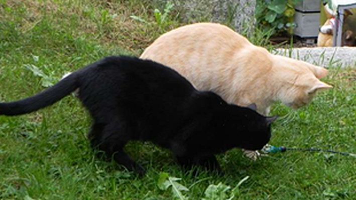 Mitte August 2023 durfte ich Alesia und Vinicius im ATS bekannt als Violetta und Vinnie abholen. Sie wurden zuerst im grossen Katzen-Spielzimmer einquartiert, um sich zu erholen und in Ruhe anzukommen. Als das restliche Haus und später der eingezäunte Garten zugänglich wurden, zeigte sich der sonst so grossspurige Vinicius eher vorsichtig, während Alesia mutg herum wuselte, überall hochkletterte, alles genaustens untersuchte und dabei leise, quiekende Geräusche von sich gab, die man eher einem Meerschweinchen als einer Katze zuschreiben würde.