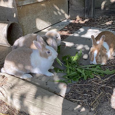 Uns geht es bestens, wir haben uns sehr gut eingelebt und geniessen unser neues Zuhause! Wir lieben das grosse Gehege, so können wir uns richtig austoben, Haken schlagen, herum springen, in der Erde buddeln, Tunnel graben und so weiter! An unser neues Gspänli mussten wir uns zuerst gewöhnen… aber jetzt finden wir diesen Kerl eigentlich ganz toll!