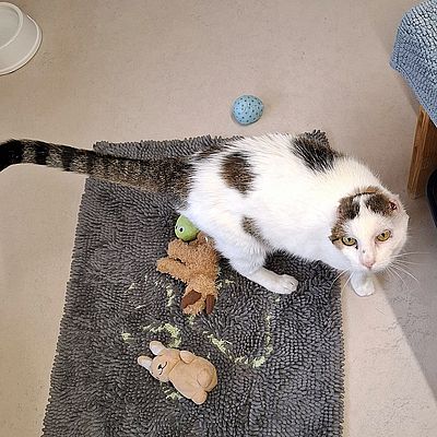 Die zutrauliche Kätzin Udine wurde Ende September in Uerkheim entdeckt. Sie litt augenscheinlich unter Ohrenkrebs und wurde zur Behandlung in die Tierklinik gebracht. Auf die Fundmeldung auf STMZ hat sich niemand gemeldet. Udine musste an beiden Ohren operiert werden. Udine hat die OP soweit gut überstanden und erholt sich nun bei uns. Udine hört nicht mehr so gut, dies hat aber nichts mit der Ohrenoperation zu tun. Sie ist zusammen mit dem blinden Kater Jimmy im Gehege und versteht sich sehr gut mit ihm.